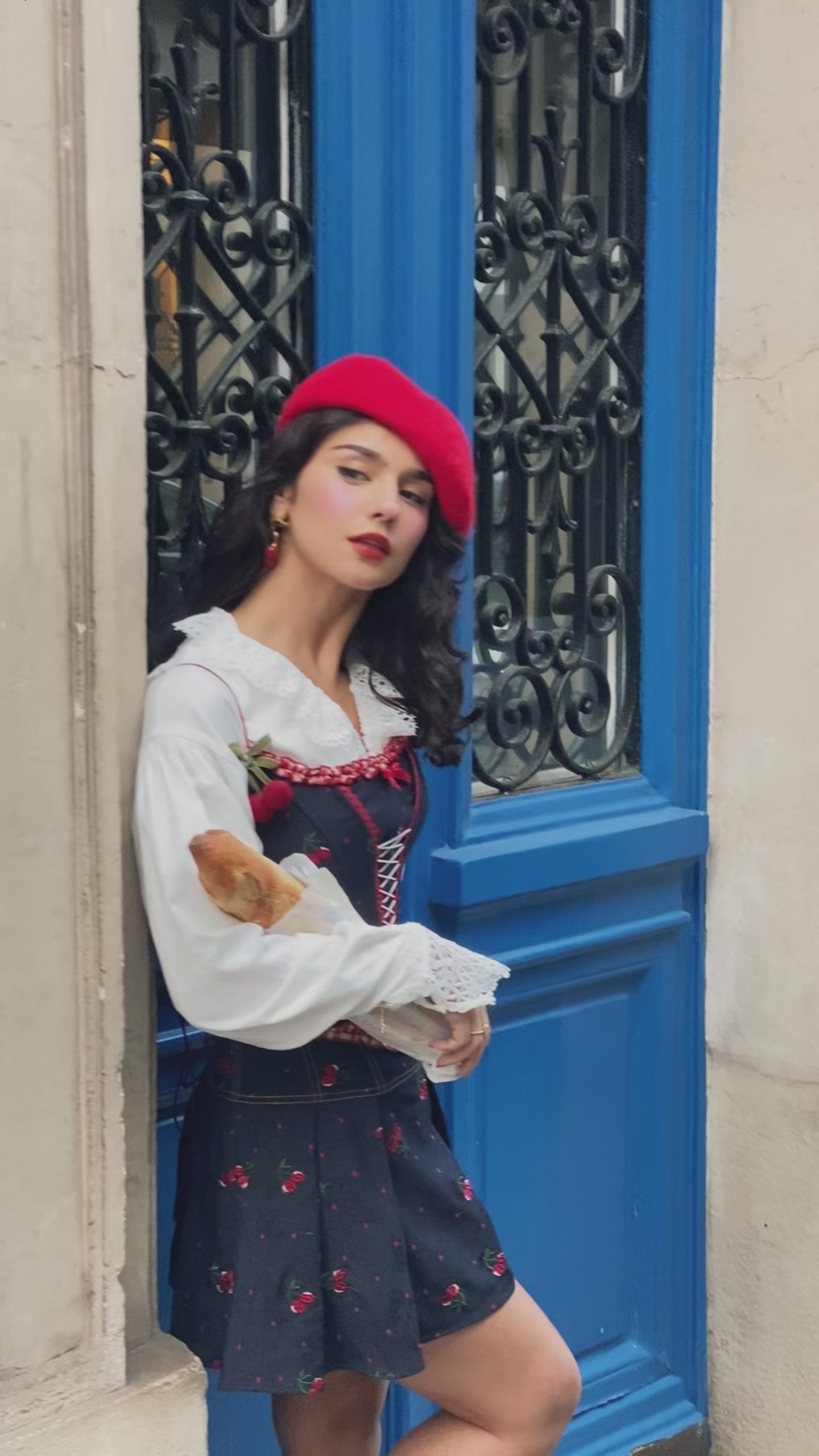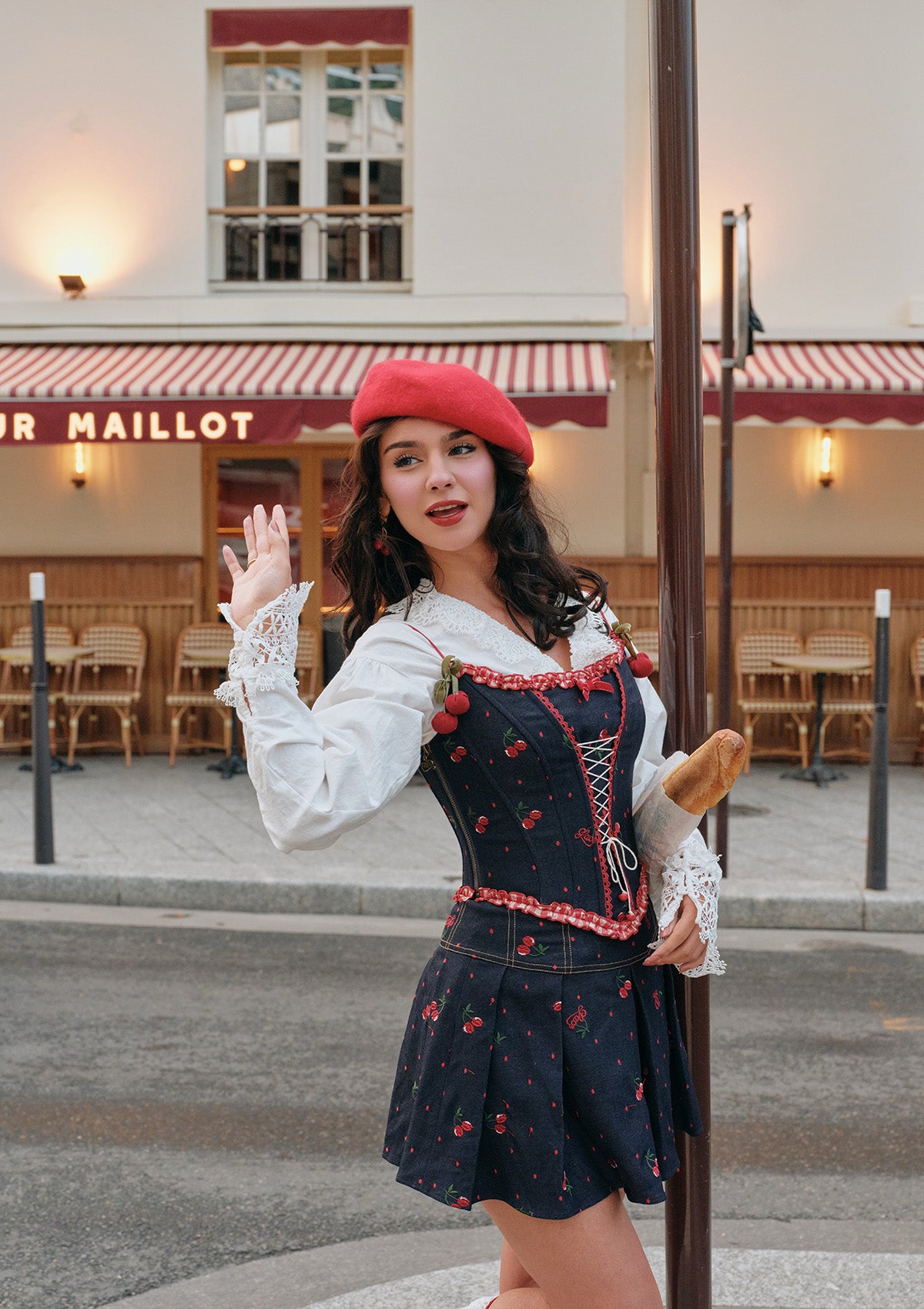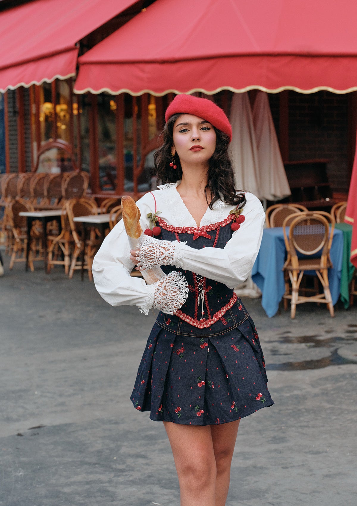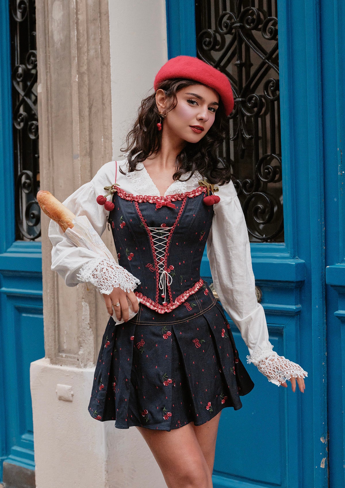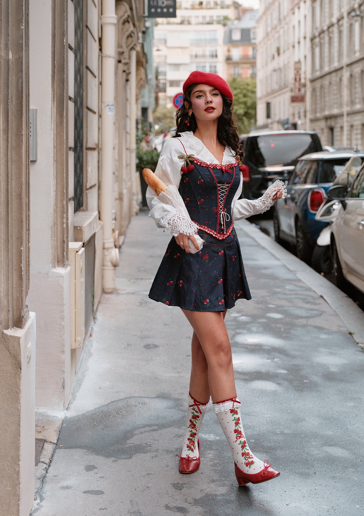Sweet, playful, and undeniably Parisian — the Cherry Cowgirl Corset captures the charm of a modern-day cowgirl with a vintage twist. Delicate hand-sewn cherry details and checkered ruffles accentuate its flirty silhouette, while structured boning and soft denim embroidery combine comfort with shape, creating a look that’s as confident as it is cute.