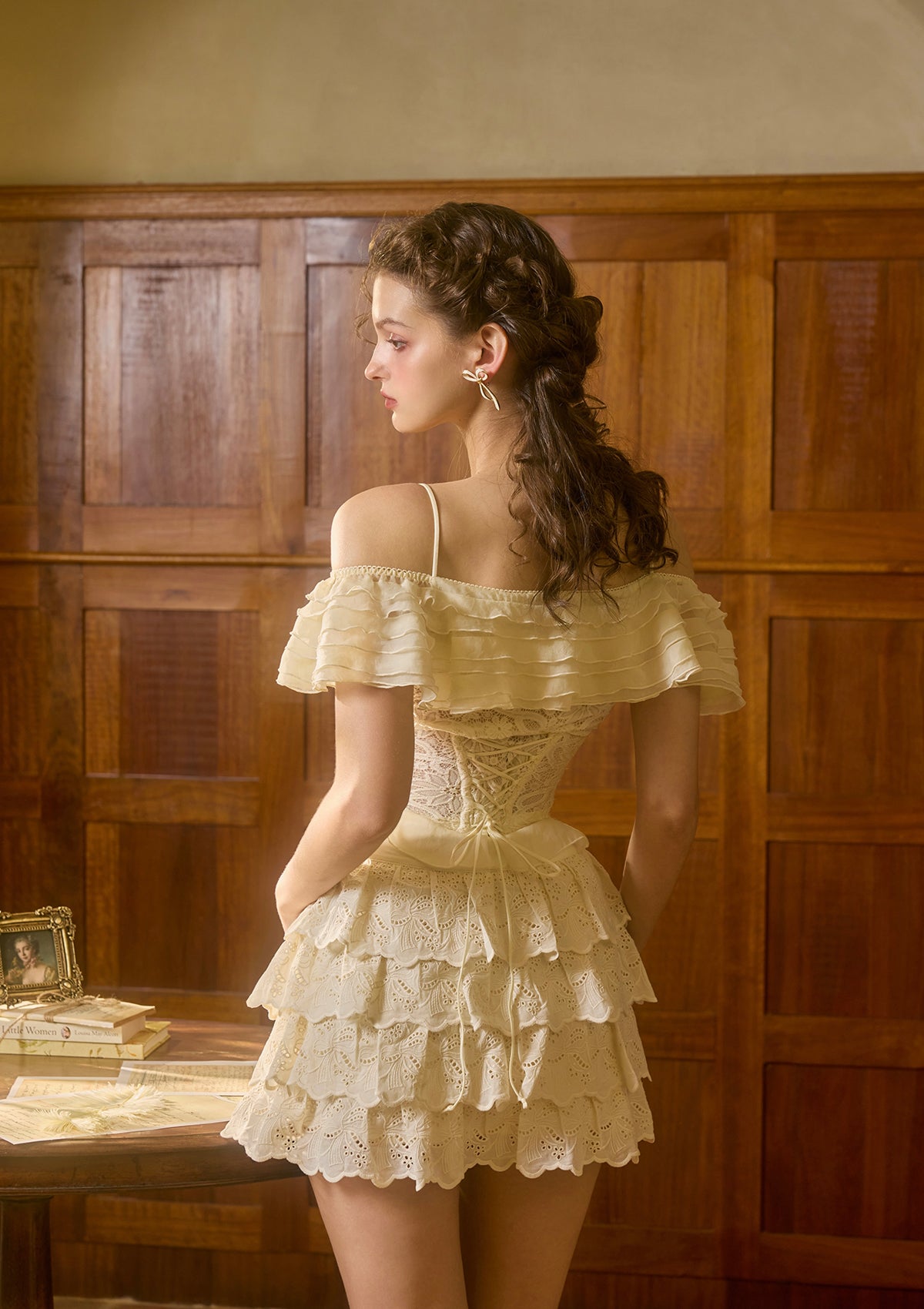- The neckline is spliced with multiple layers of ruffles, which is romantic and elegant.